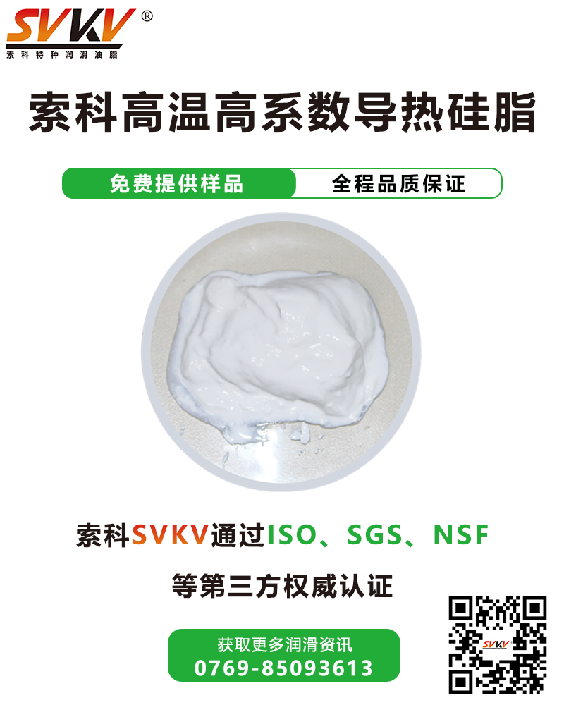 索科SVKV高溫高系數導熱硅脂以聚硅氧烷為基礎輔以高導熱填料精制而成,安全環保,性能穩定,既具有優異的電絕緣性,又具有優異的導熱性,揮發性小,可薄膜涂覆。